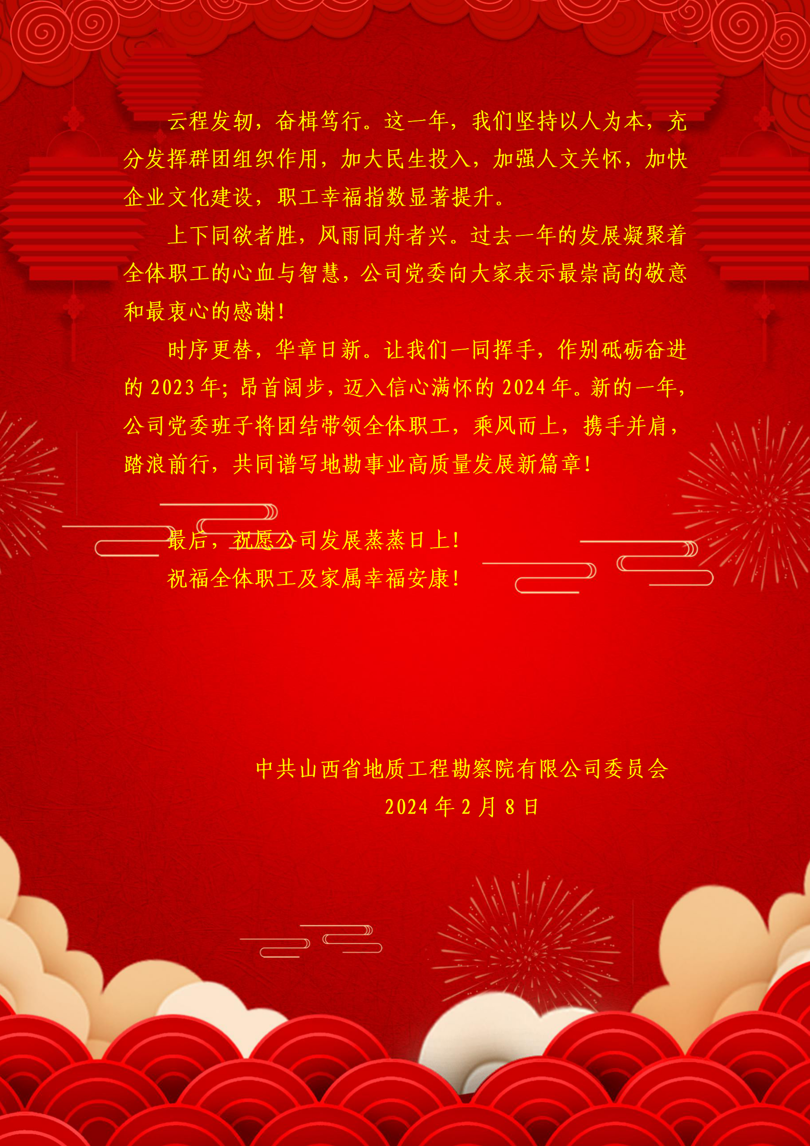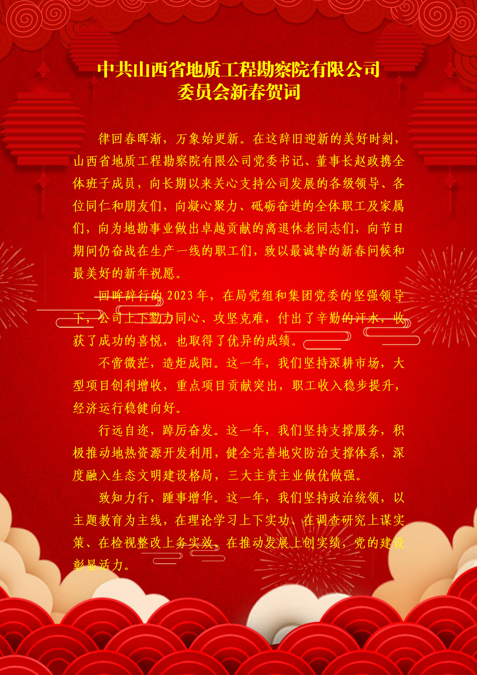 【概要描述】 律回春晖渐,万象始更新。在这辞旧迎新的美好时刻必威官网党委书记、董事长赵政携全体班子成员,向长期以来关心支持公司发展的各级领导、各位同仁和朋友们,向凝心聚力、砥砺奋进的全体职工及家属们,向为地勘事业做出卓越贡献的离退休老同志们,向节日期间仍奋战在生产一线的职工们,致以最诚挚的新春问候和最美好的新年祝愿。